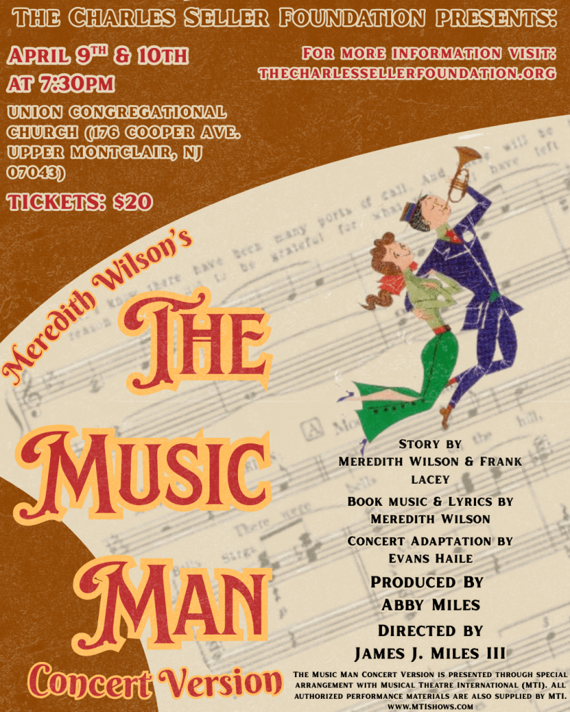 The Charles Seller Foundation is proud to announce our upcoming production of the Music Man (Concert Version)! Performances will take place on April 9th and 10th at 7:30pm at Union Congregational Church (176 Cooper Ave. Upper Montclair, Nj 07043).