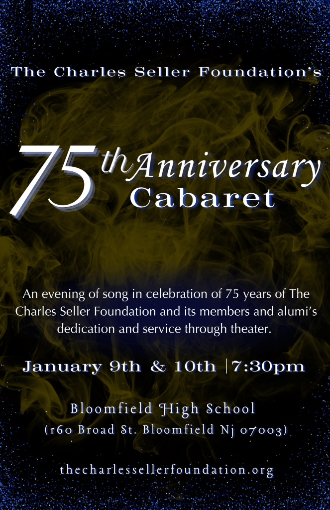 The Charles Seller Foundation is pleased to present our 75th Anniversary Cabaret! This cabaret will be a variety show in celebration of 75 years of The Charles Seller Foundation and it’s members and alumni’s dedication and service to others through theatre. The Cabaret will be held on January 9th and 10th at 7:30pm at Bloomfield High School! (160 Broad St. Bloomfield, NJ 07003).