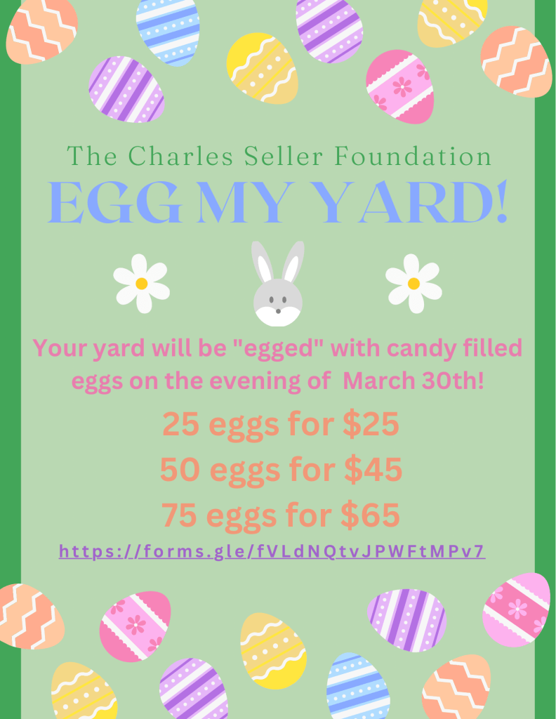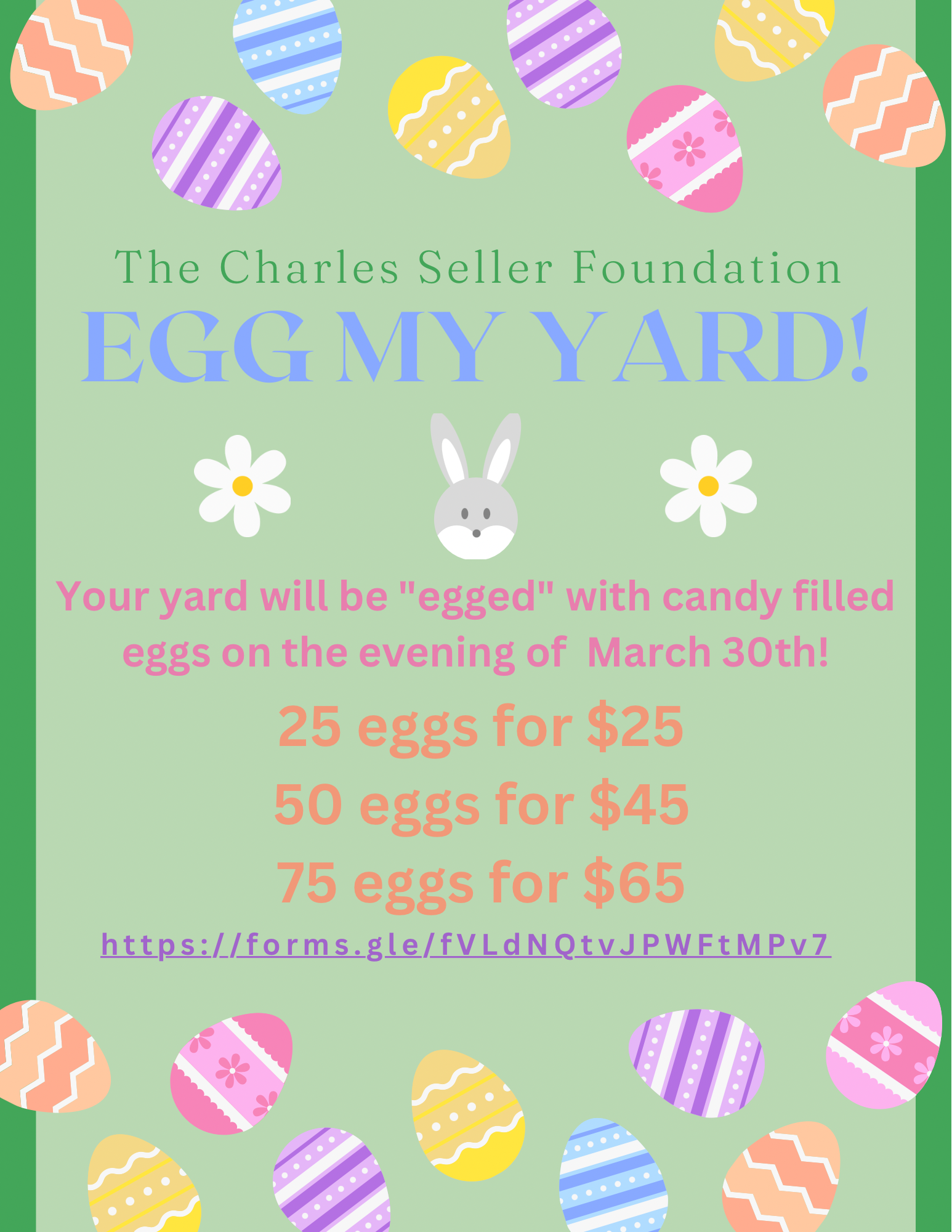 The Charles Seller Foundation will be holding an “Egg My Yard” fundraiser on March 30th, 2024! Our members will arrive at your chosen time slot and fill your yard with candy filled eggs making for a wonderful and stress-free egg hunt! 🐰🐣🌷