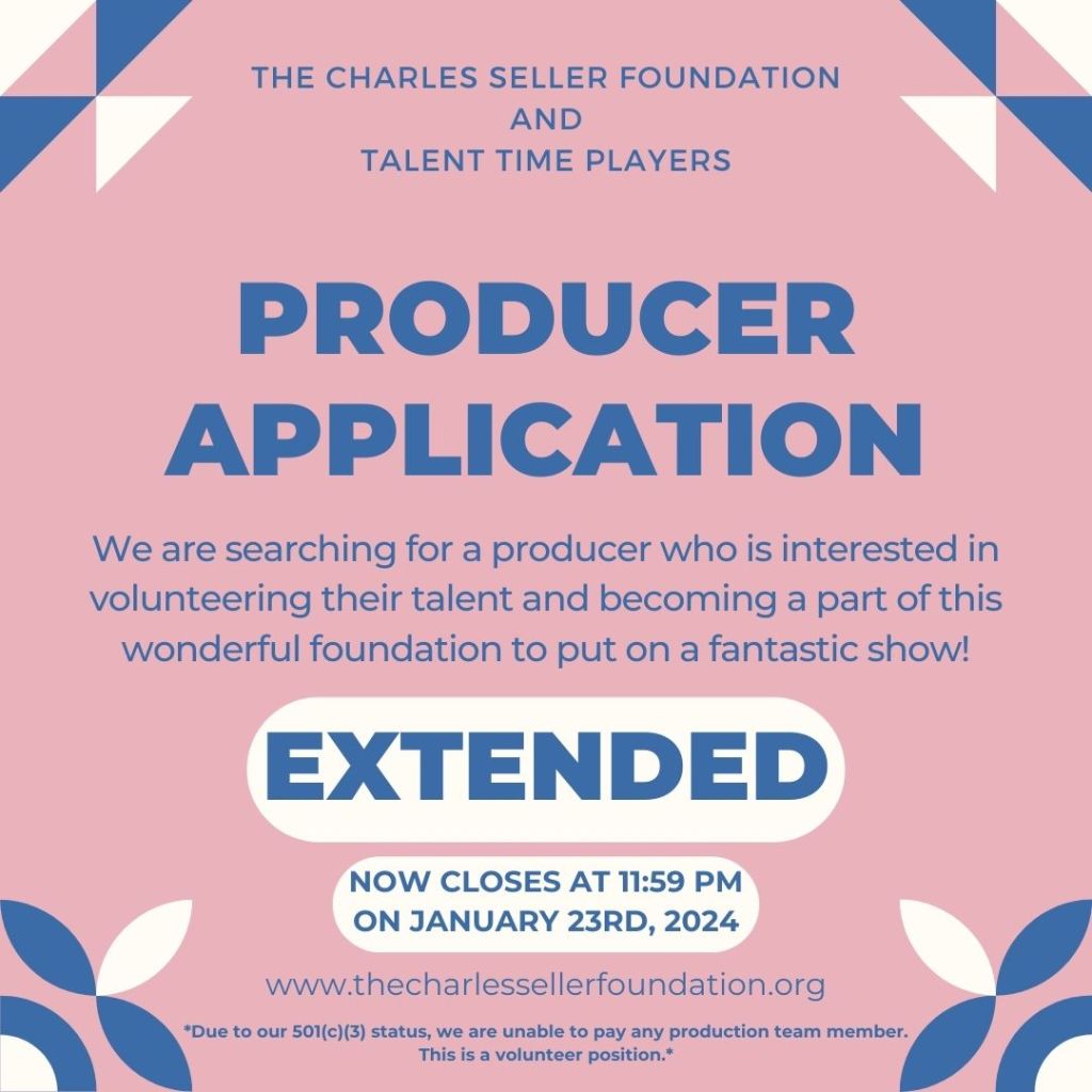 The Charles Seller Foundation and Talent Time Players are in search of a producer for our musical in the summer of 2024! We are searching for a producer who is interested in volunteering their talent and becoming a part of this wonderful foundation to put on a fantastic show.