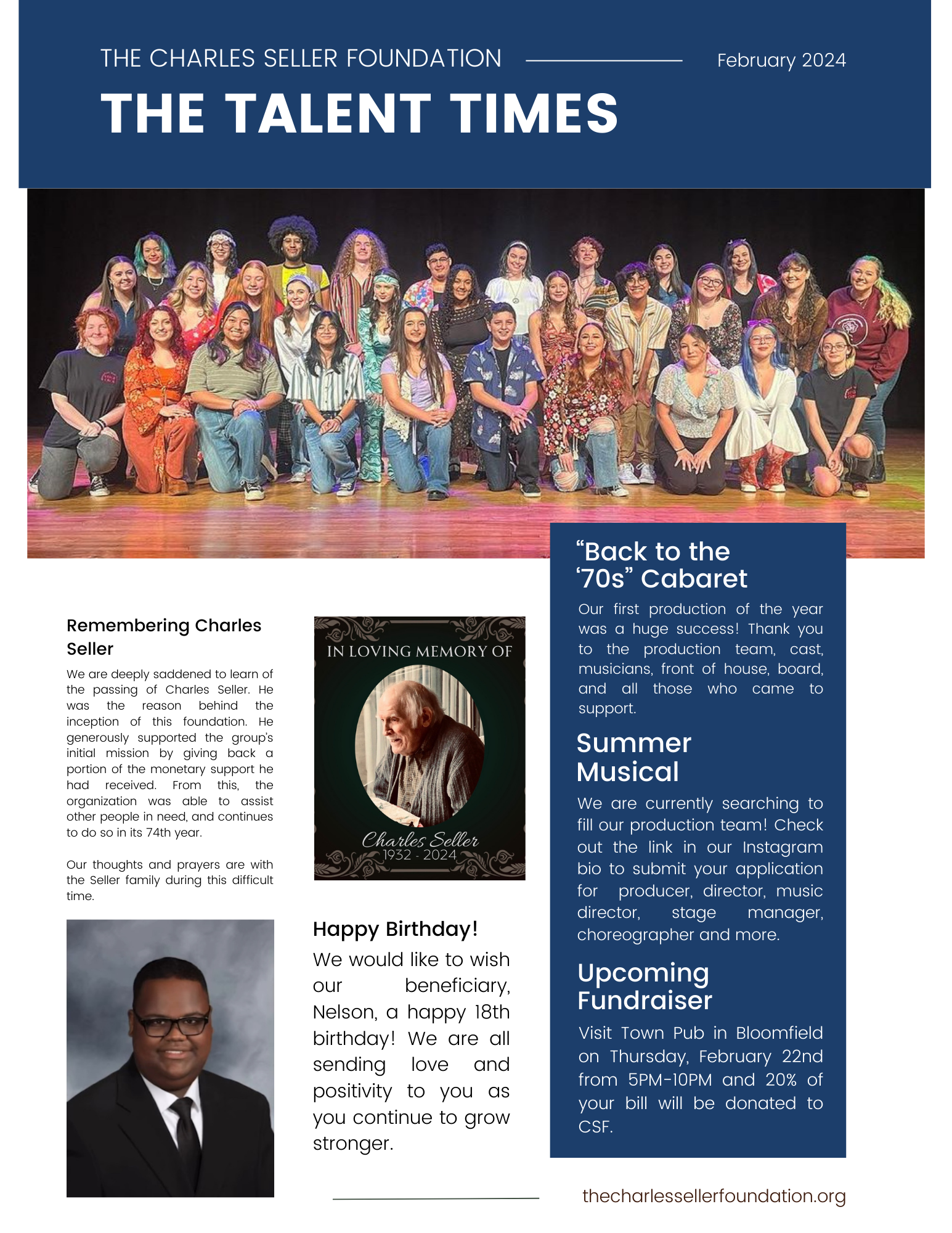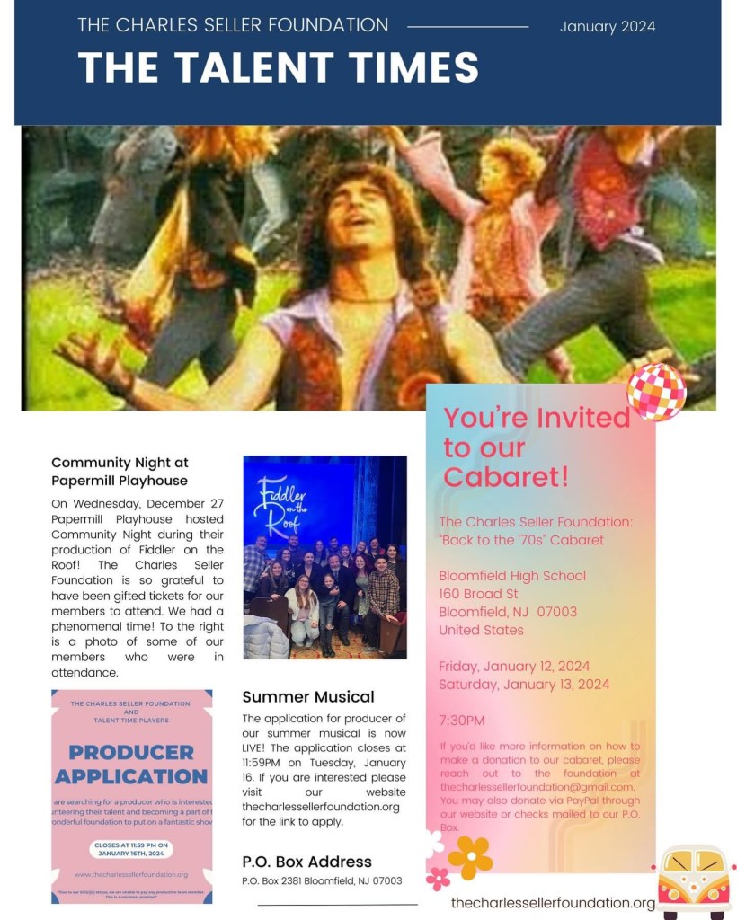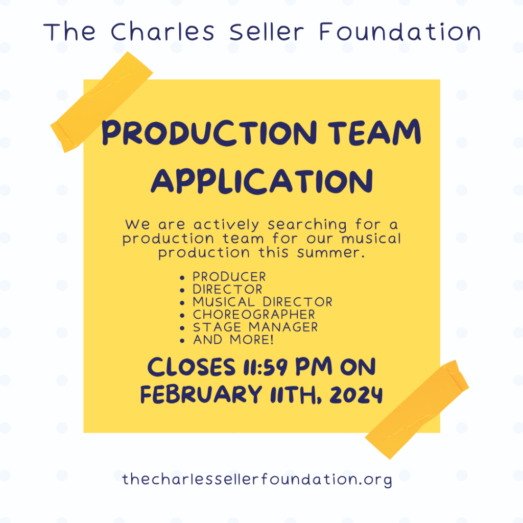 The Charles Seller Foundation and Talent Time Players are in search of a production team for our musical in the summer of 2024! We are searching for producers, directors, musical directors, choreographers and stage managers who are interested in volunteering their talent and becoming a part of this wonderful foundation to put on a fantastic show.