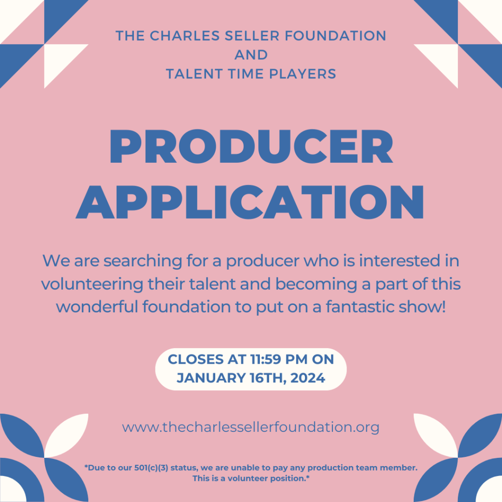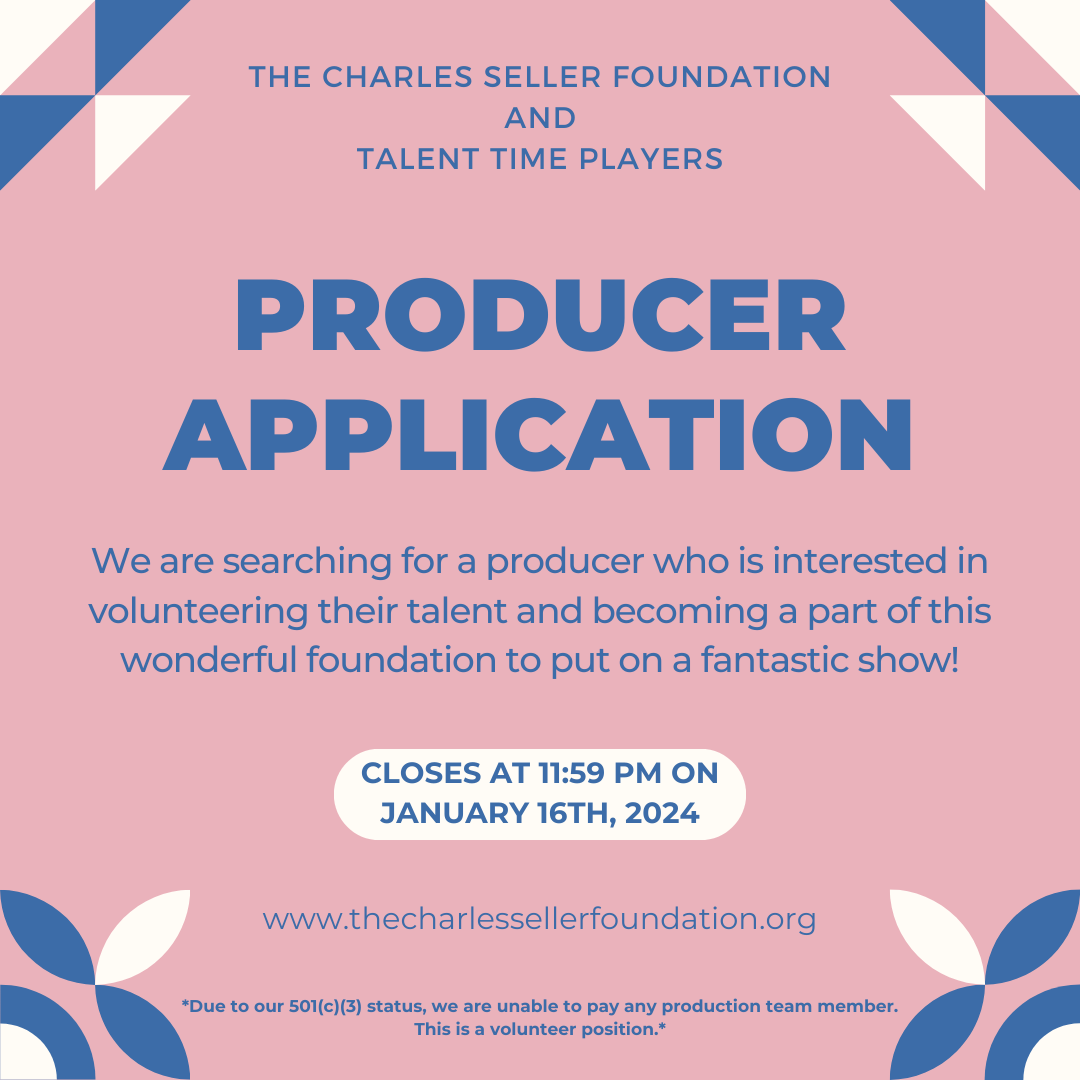 The Charles Seller Foundation and Talent Time Players are in search of a producer for our musical in the summer of 2024! We are searching for a producer who is interested in volunteering their talent and becoming a part of this wonderful foundation to put on a fantastic show.